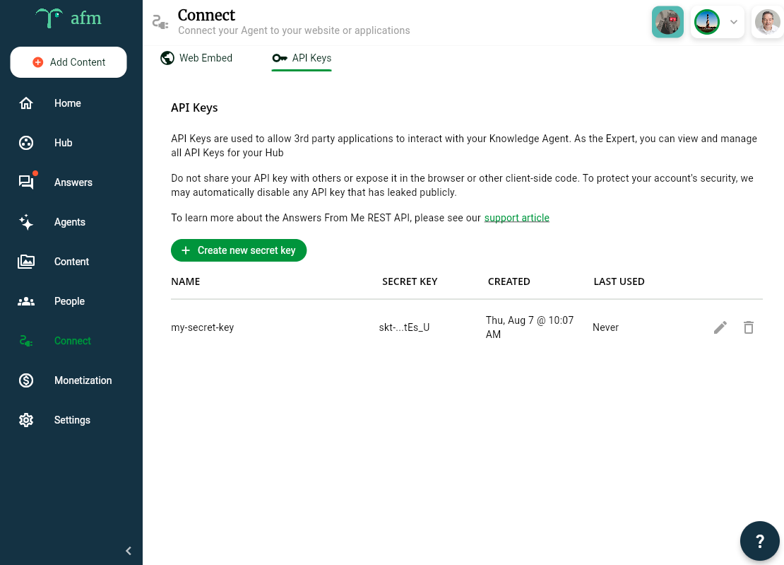 Now any developer can interact with an Expert's Knowledge Assistant via a simple REST API, using a secret key tied to the Expert's Knowledge Hub.