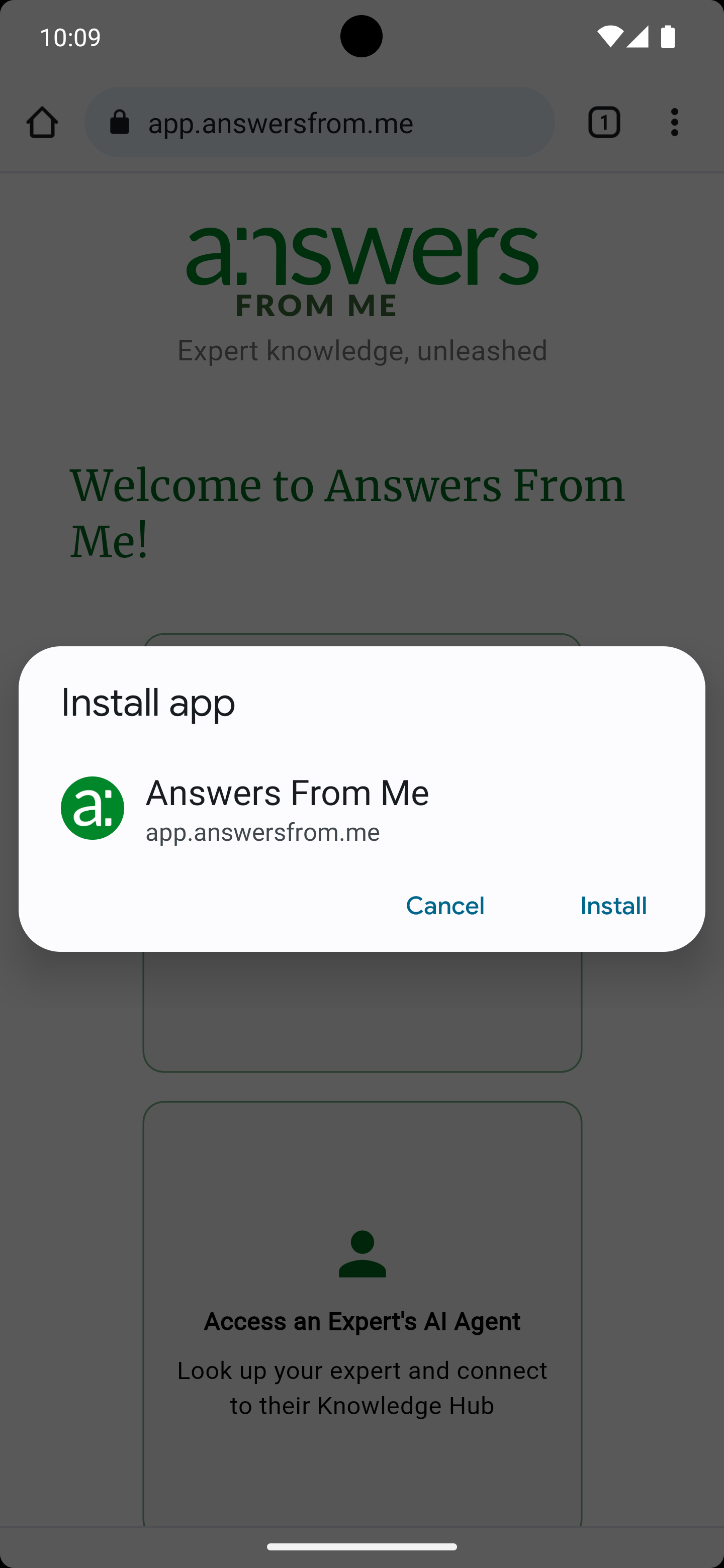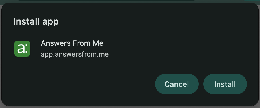 1. Open your mobile browser. 2. Go to https://app.answersfrom.me 3. Once the page is fully loaded, tap the three vertical dots icon in the upper right to show page options, 4. Scroll down until you see Install app and then tap it. 5. You’ll be asked to confirm installation. Click Install app and then Add to home screen 6. Whenever you close the browser and view your home screen, you should now see a new icon labeled “Answers” that you can move to a convenient location. |