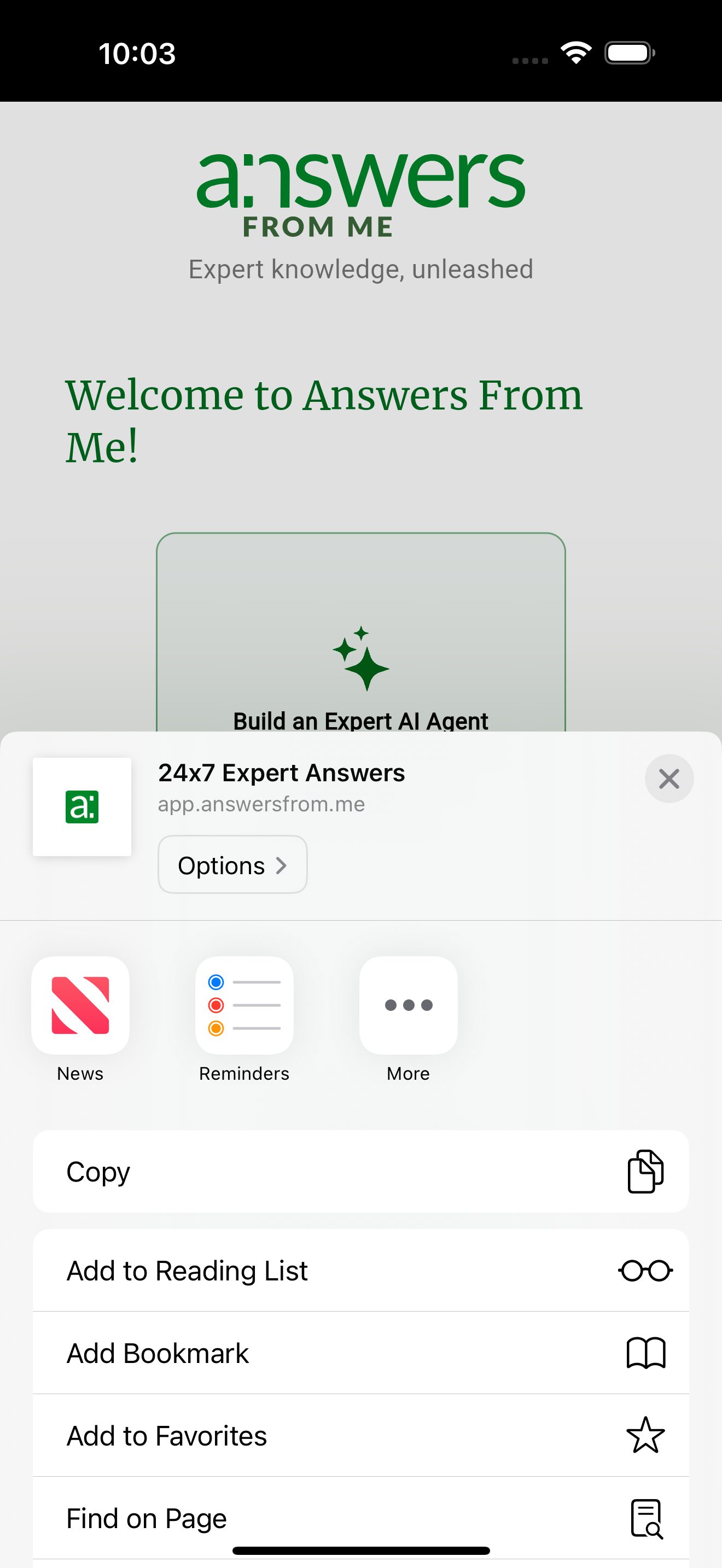 ![]() | 1. Open Safari on your iPhone/iPad. 2. Go to https://app.answersfrom.me 3. Once the page is fully loaded, tap the Share button. That’s the square with an up arrow, at the bottom of the screen (on iPhone) or top-right (on iPad). 4. In the Share sheet that slides up, scroll down until you see Add to Home Screen and then tap it.